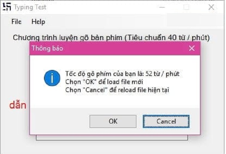 Bước 6: Sau khi gõ xong một đoạn văn bản, phần mềm sẽ tính thời gian và số từ bạn đã gõ. Kết quả cuối cùng, tức là tốc độ gõ sẽ được hiển thị. Để tiếp tục sử dụng đoạn văn bản đó, bạn có thể nhấn Cancel hoặc OK để tải file mới.
