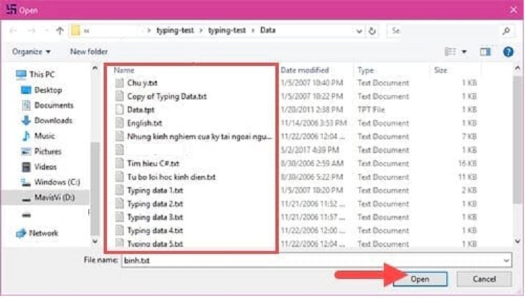 Bước 8: Tiếp theo, bạn có thể chọn các file gõ có sẵn trong phần mềm luyện gõ 10 ngón hoặc tự tạo file mới định dạng TXT để thường xuyên luyện gõ 10 ngón.