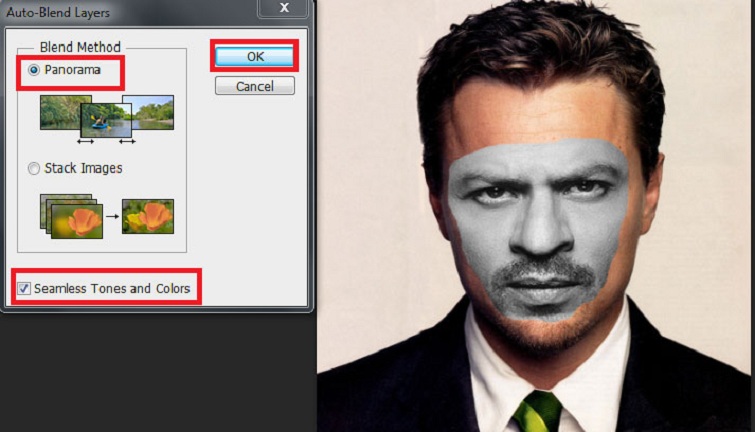 - Trong hộp thoại, chọn tùy chọn Panorama và Seamless Tones and Colors, rồi nhấn OK để hoàn tất.