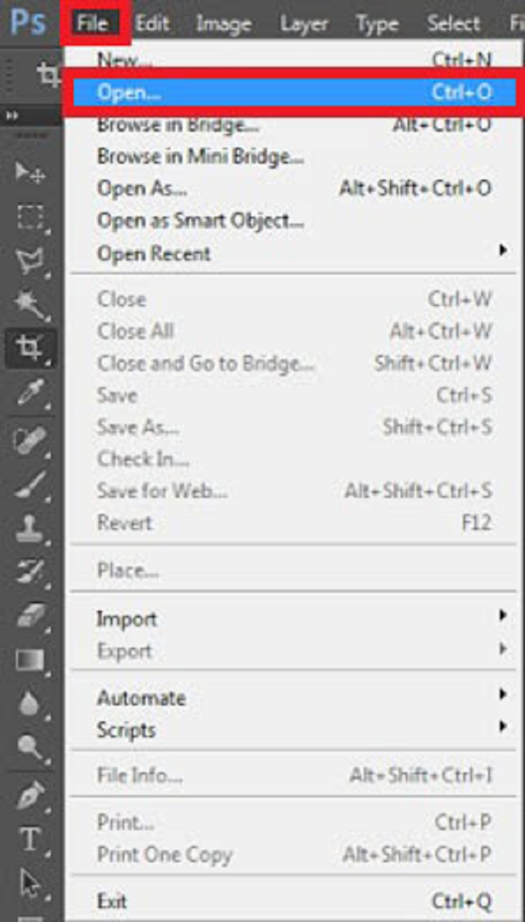 - Mở phần mềm Photoshop trên máy tính, chọn menu "File" rồi nhấn "Open" để tải bức ảnh nền mà bạn muốn sử dụng từ thư mục lưu trữ.