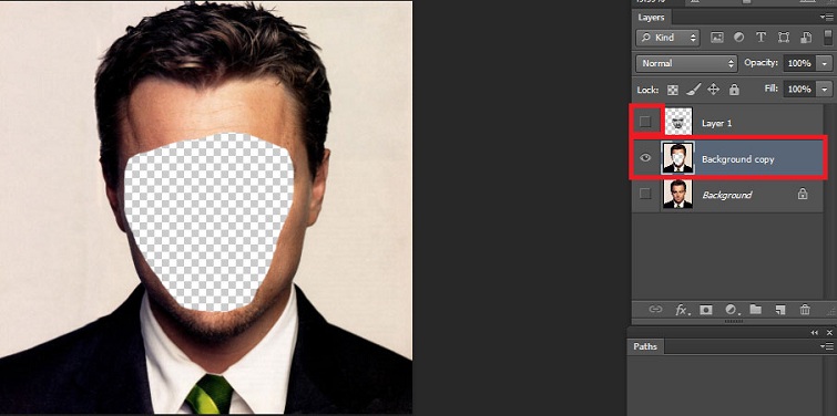 - Trên layer sao chép, nhấn Backspace để xóa phần thừa, tạo độ trong suốt. Kiểm tra bằng cách bật/tắt biểu tượng mắt trên layer.