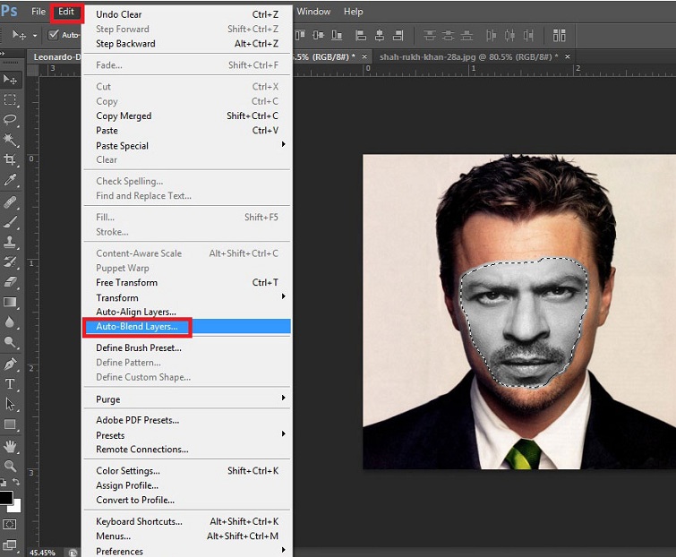 - Hủy chọn vùng bằng Ctrl+D, sau đó chọn cả hai layer và áp dụng Edit > Auto-Blend Layers.