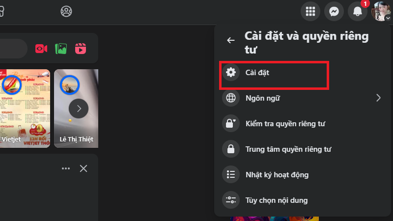Bước 1: Truy cập facebook.com → Nhấn ảnh đại diện góc trên phải