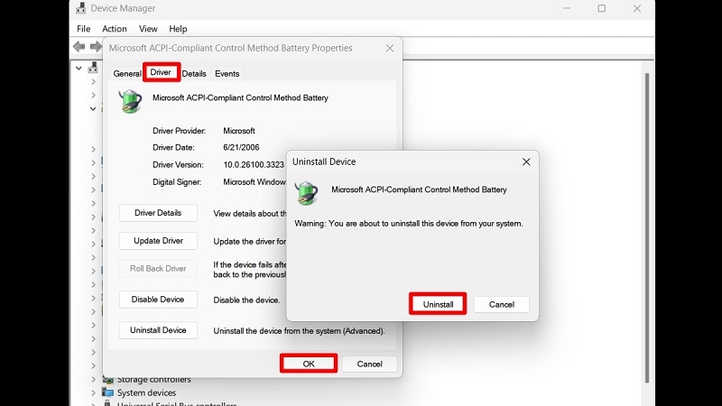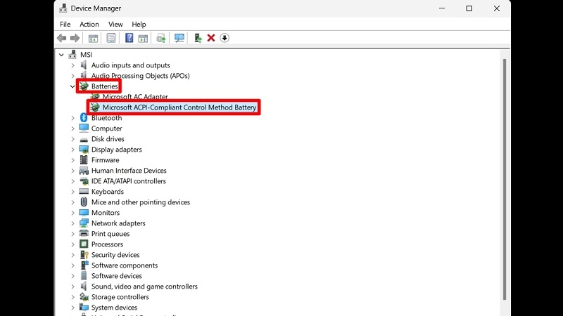 - Gỡ driver tại Batteries > Microsoft ACPI-Compliant Control Method Battery > Uninstall.