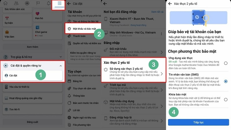 Vào Cài đặt → Bảo mật và đăng nhập → Xác thực hai yếu tố. Chọn xác thực qua ứng dụng (Google Authenticator, Duo Mobile) thay vì SMS để bảo mật tốt hơn.