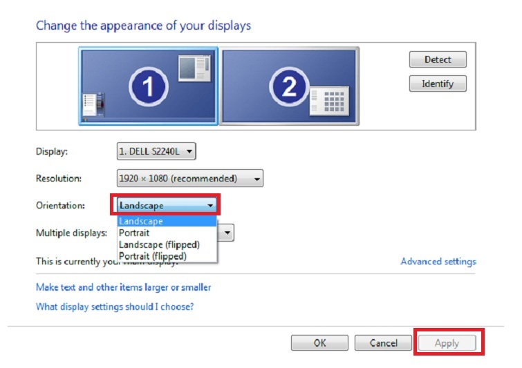 Sau khi đã vào phần Screen resolution, bạn hãy lựa chọn mục Orientation. Tiếp theo, chọn Landscape và nhấn nút Ok để đưa màn hình laptop trở lại trạng thái bình thường.