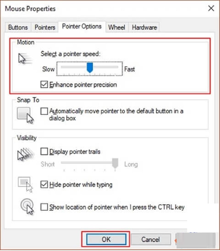 - Trong Pointer Options > Motion, kéo thanh trượt (trái để chậm, phải để nhanh).