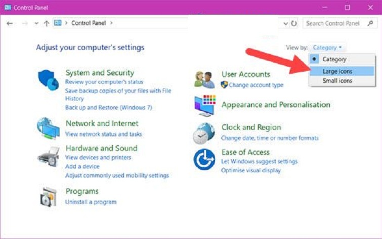 Bước 5: Khi hộp thoại Control Panel xuất hiện, bạn hãy tiếp tục nhấn vào Category, sau đó chọn Large icon. Điều này giúp hiển thị tất cả các mục trong Control Panel dưới dạng biểu tượng lớn để thuận tiện trong việc tìm kiếm và quản lý các cài đặt.
