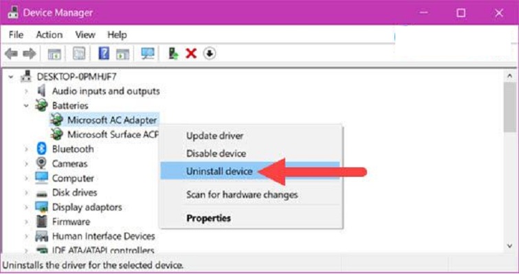 Bước 7: Trong hộp thoại Device Manager, bạn tiếp tục tìm phần Batteries > click chuột phải vào tất cả các dòng xuất hiện trong phần này > sau đó chọn Uninstall device để gỡ toàn bộ chúng ra.