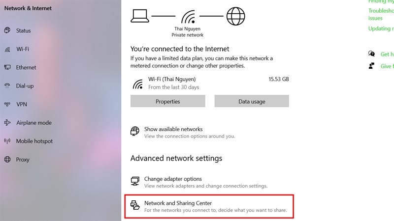 Bước 2: Trong cửa sổ Status, chọn Network and Sharing Center.