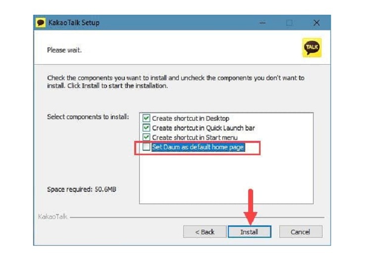 Bước 4: Lưu ý rằng, ở bước này, ứng dụng KakaoTalk đang cố gắng đặt Daum làm trang chủ của bạn. Hành động này có thể gây khó chịu cho nhiều người, do đó, tốt nhất là bỏ dấu tích và tiếp tục quá trình cài đặt.
