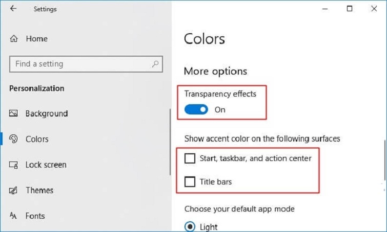 Bên dưới là 2 tùy chọn cho phép bạn cài đặt màu cho Start, taskbar, action center cùng với title bar. Bạn chỉ cần tích chọn vào mục mà bạn muốn áp dụng màu cho nó là được.
