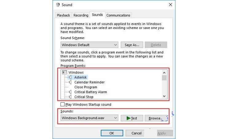 Khi nhấn vào tùy chọn này, một cửa sổ cài đặt âm thanh cho hệ thống sẽ hiển thị. Đối với mục này, bạn có thể tuỳ chọn âm báo cho từng tác vụ trên Windows 10. Đồng thời, bạn cũng có thể chọn các âm báo từ danh sách có sẵn. Hoặc bấm vào nút "Browse" để chọn một tập tin âm thanh bạn đã chuẩn bị trước. Sau khi đã thiết lập xong, bạn nhấn OK để lưu lại tất cả các thay đổi.