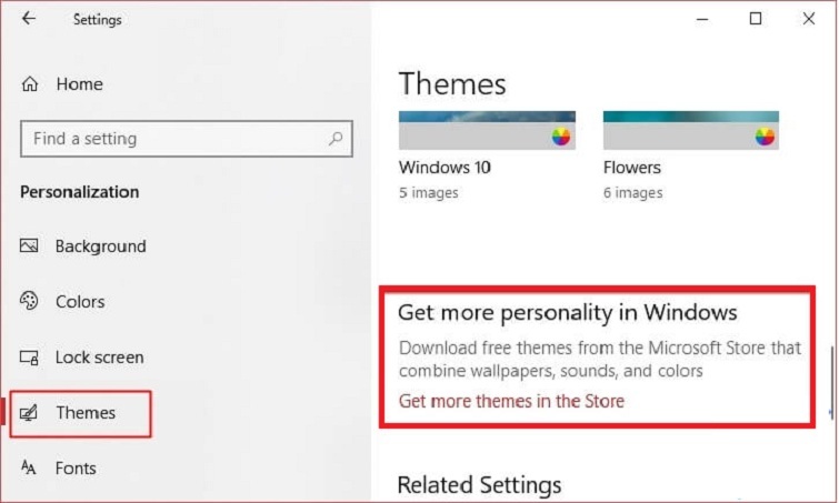 Bước 2: Khi cửa sổ Settings hiển thị, hãy chọn "Themes" từ phần khung bên trái. Trong khung bên phải, bạn chọn vào mục "Get more themes in the Store" để tiếp tục.