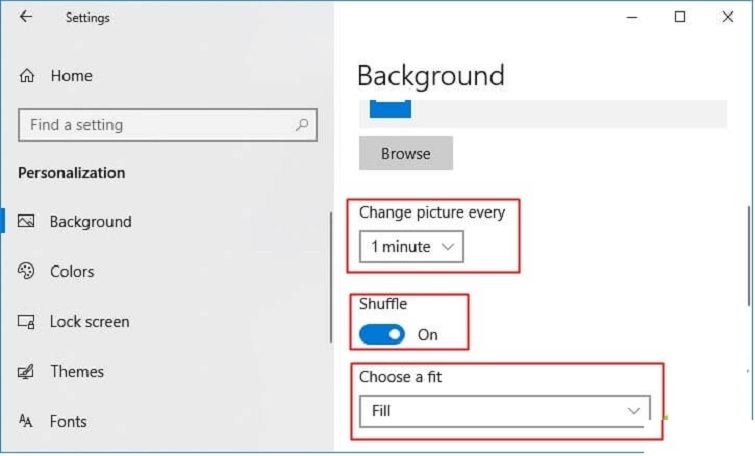 - Change picture every: khoảng thời gian mỗi lần thay hình nền khác.