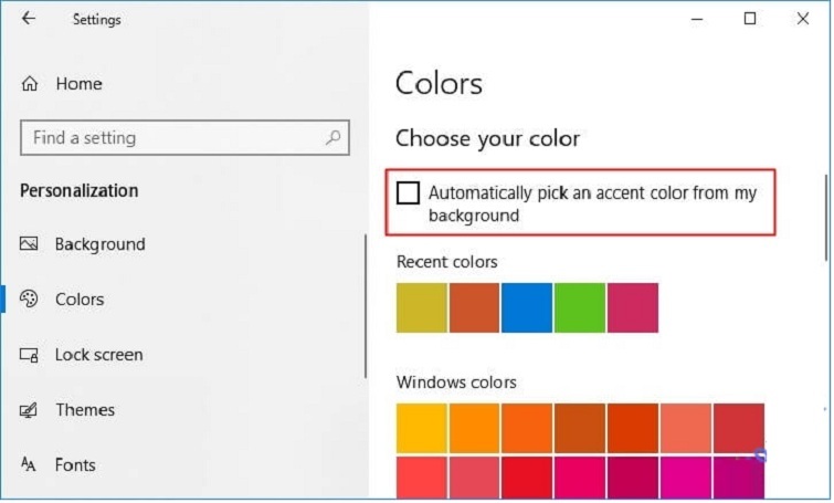 Nếu bạn muốn tự chọn màu sắc theo ý thích của mình, hãy tắt tính năng Automatically pick an accent color from my background. Sau đó, chọn một màu bạn muốn từ bảng Windows colors. Hoặc bạn cũng có thể chọn mục Custom color rồi kéo thanh trượt để chọn màu sắc theo ý thích.