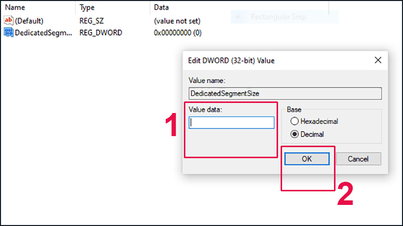 Bước 5: Double-click DedicatedSegmentSize, chọn Decimal, nhập giá trị (ví dụ: 512 cho 512MB).