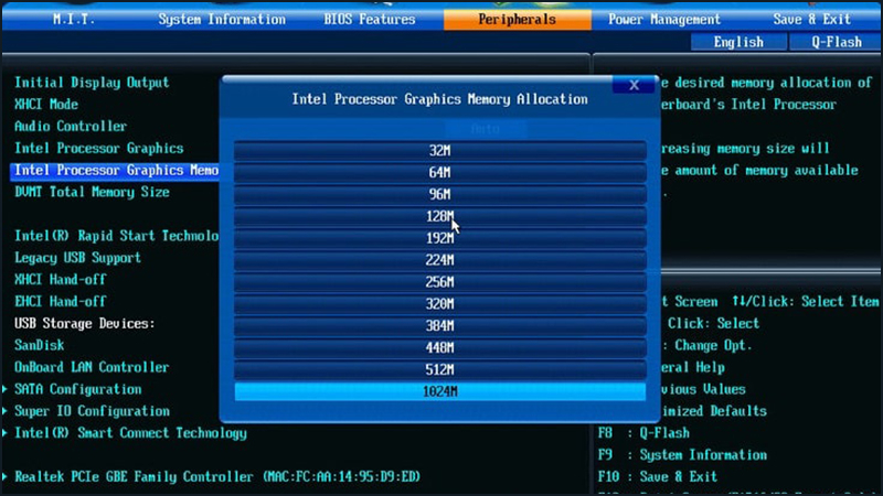 Bước 3: Chọn Graphics Settings, Video Settings hoặc VGA Share Memory Size.