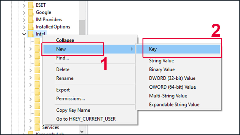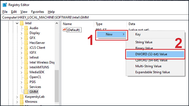 Bước 3: Click phải vào Intel > New > Key, đặt tên GMM.