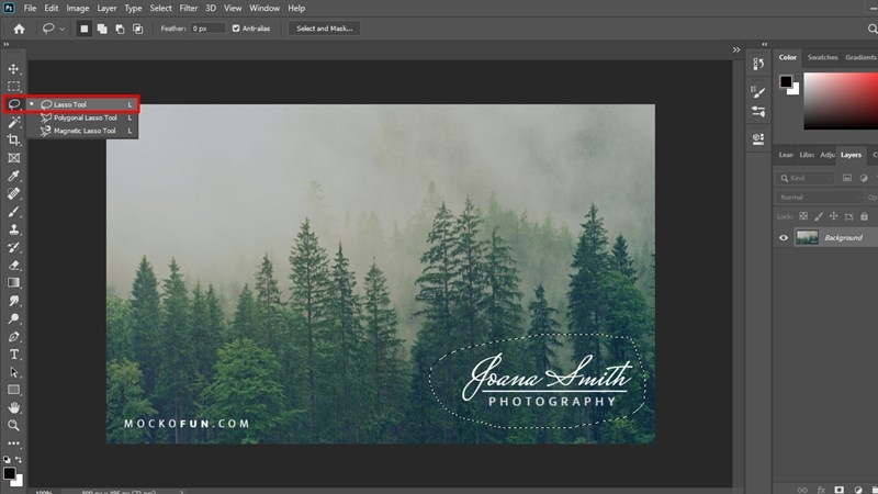 Bước 2: Chọn công cụ Lasso Tool (L) hoặc Quick Selection Tool (W) để tạo vùng chọn bao quanh watermark. Đảm bảo vùng chọn bao trùm hoàn toàn watermark với khoảng cách 5-10 pixel xung quanh.