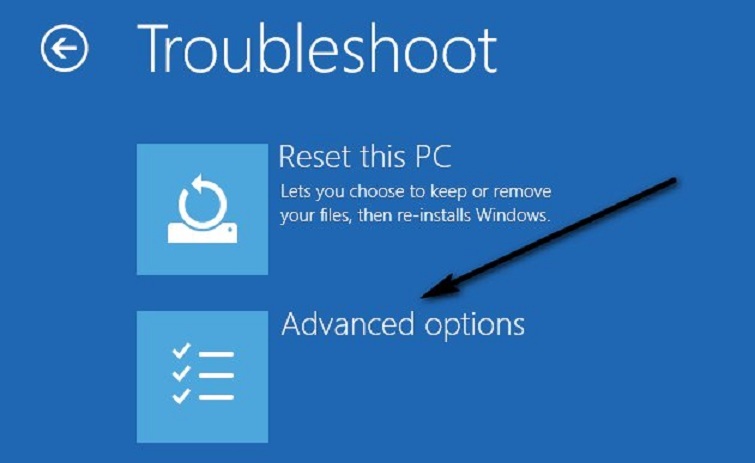 Bước 2: Tại giao diện mới hiển thị, bạn chọn Troubleshoot >> Chọn Advanced Options để tiếp tục.