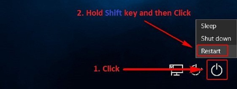 Bước 1: Tại vị trí góc dưới màn hình Welcome, bạn lần lượt nhấn vào Power >> Nhấn giữ phím Shift và nhấn vào tùy chọn Restart.
