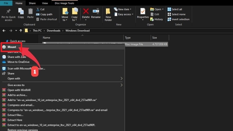 Bước 2: Mount file ISO: Nhấp chuột phải vào file ISO và chọn "Mount" để tạo ổ đĩa ảo. Nếu sử dụng USB boot, hãy tạo bằng công cụ Rufus hoặc Media Creation Tool từ Microsoft.