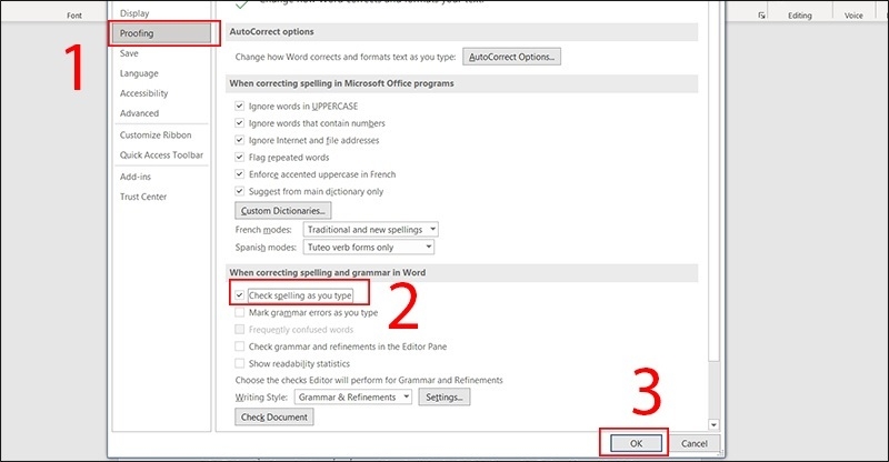 Bước 3: Chuyển đến mục "Proofing" trong cửa sổ cài đặt