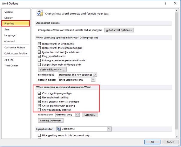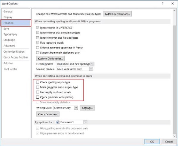 - Bỏ chọn "Frequently confused words" (tùy chọn)