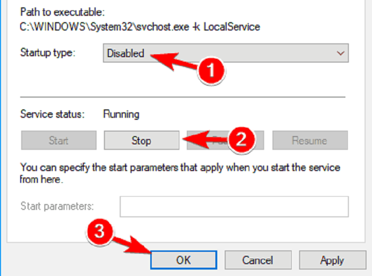 Bước 6: Tương tự như vậy, Stop dịch vụ nếu nó đang hoạt động và cài đặt Startup Type là Disabled rồi tiến hành lưu các thay đổi.