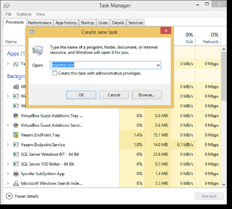 Bước 6: Lúc này, một cửa sổ tạo mới nhiệm vụ (Create New Task) sẽ xuất hiện. Tại đây, nhập "explorer.exe" vào ô Open và nhấn nút OK.