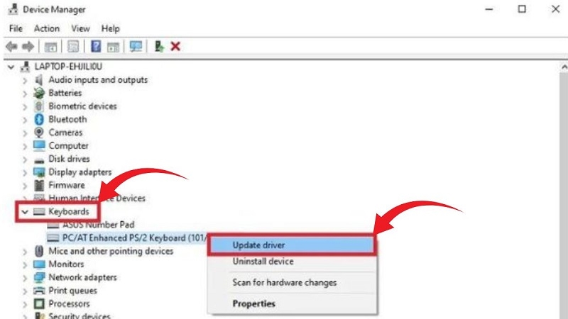 - Mở rộng phần Keyboards, chuột phải vào thiết bị bàn phím, chọn Update driver > Search automatically for drivers.