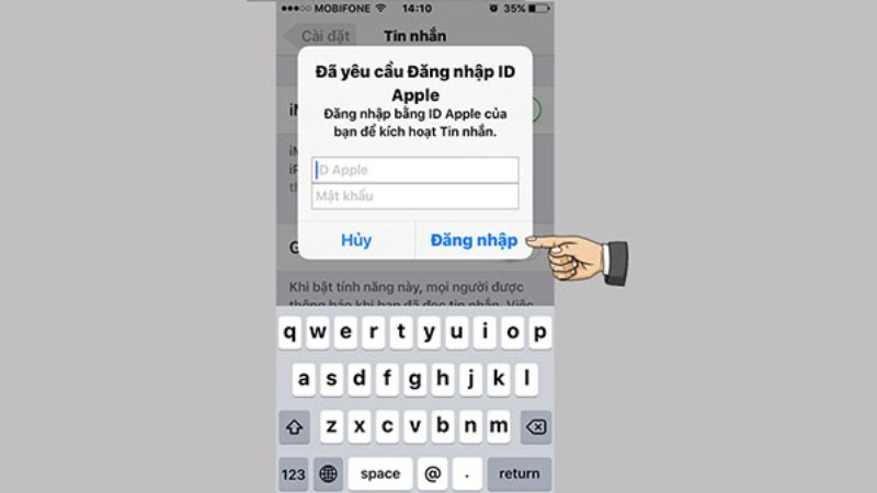 Bước thứ 2: Bạn hãy nhập thông tin ID Apple và Password vào hai ô trống yêu cầu. ( hãy nhập số điện thoại hoặc email mà bạn muốn sử dụng để nhận tin nhắn iMessage).